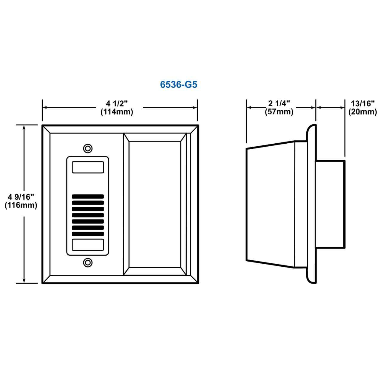 The 6536-G5 Horn/Strobe is designed for use in a single gang 2" (51mm) x 4" (102) electrical wall box. Each unit contains an audible horn signal which generates an 82 dBA sound pressure level at 10 ft. and a high intensity candela strobe.