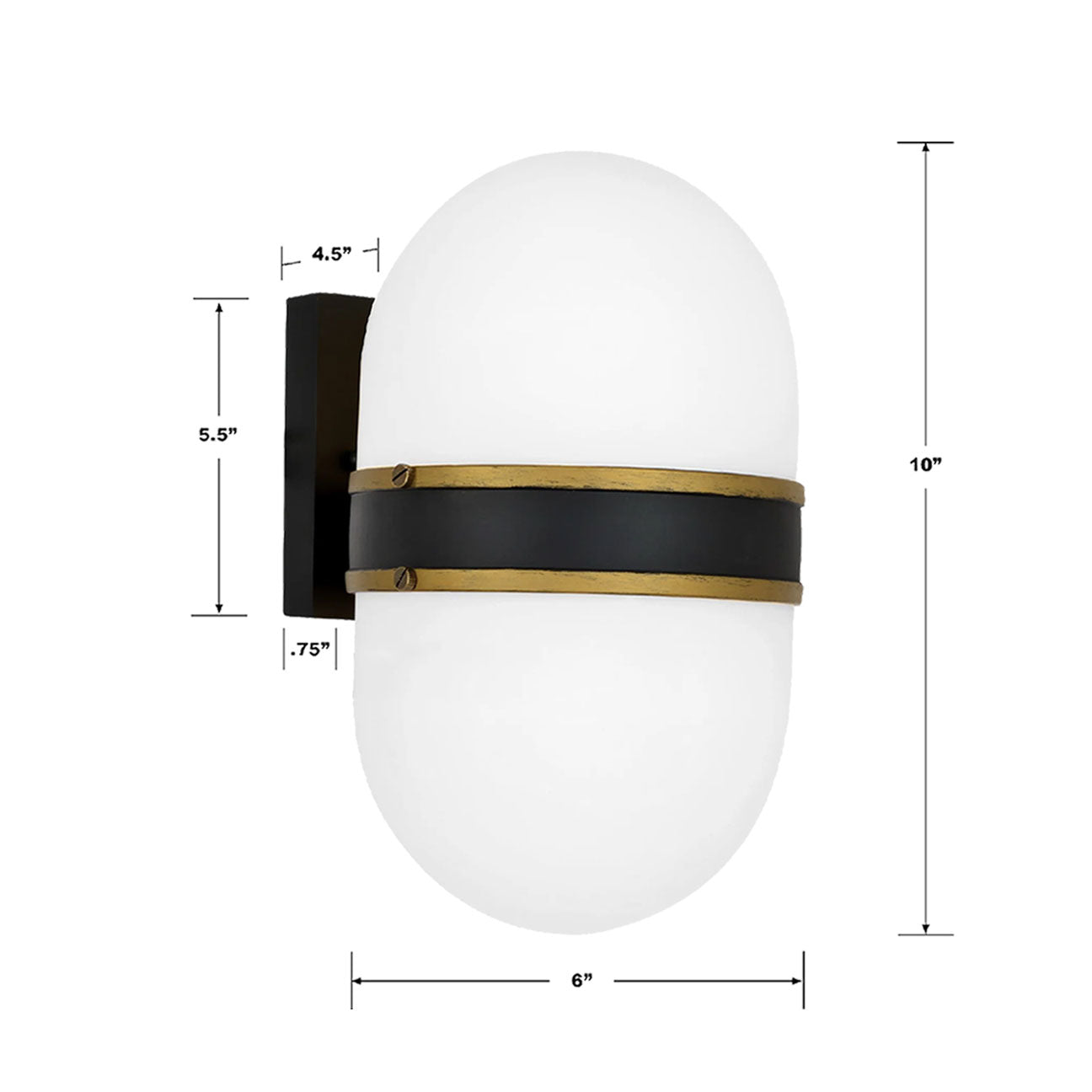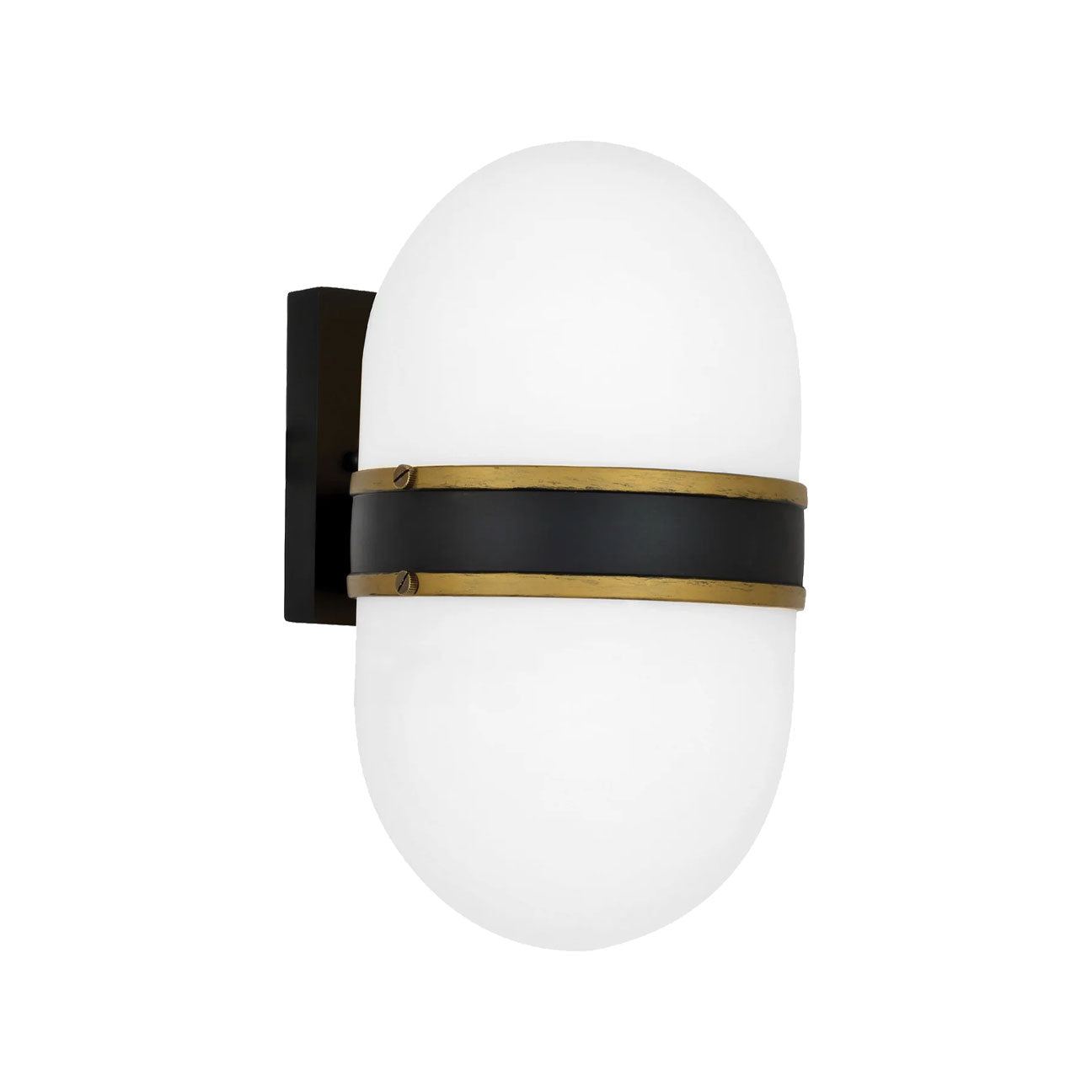 Brian Patrick Flynn's futuristic Capsule Collection adds a touch of industrial grace to front entrances, outdoor chat settings or romantic garden pathways. The egg-shaped design of this outdoor fixture combines a matte black base and opal frosted white glass globe with a distinct, textured gold band. The innovative three-toned design brings instant personality and creates a unique statement for any outdoor space. Capsule can be used outdoors or indoors.