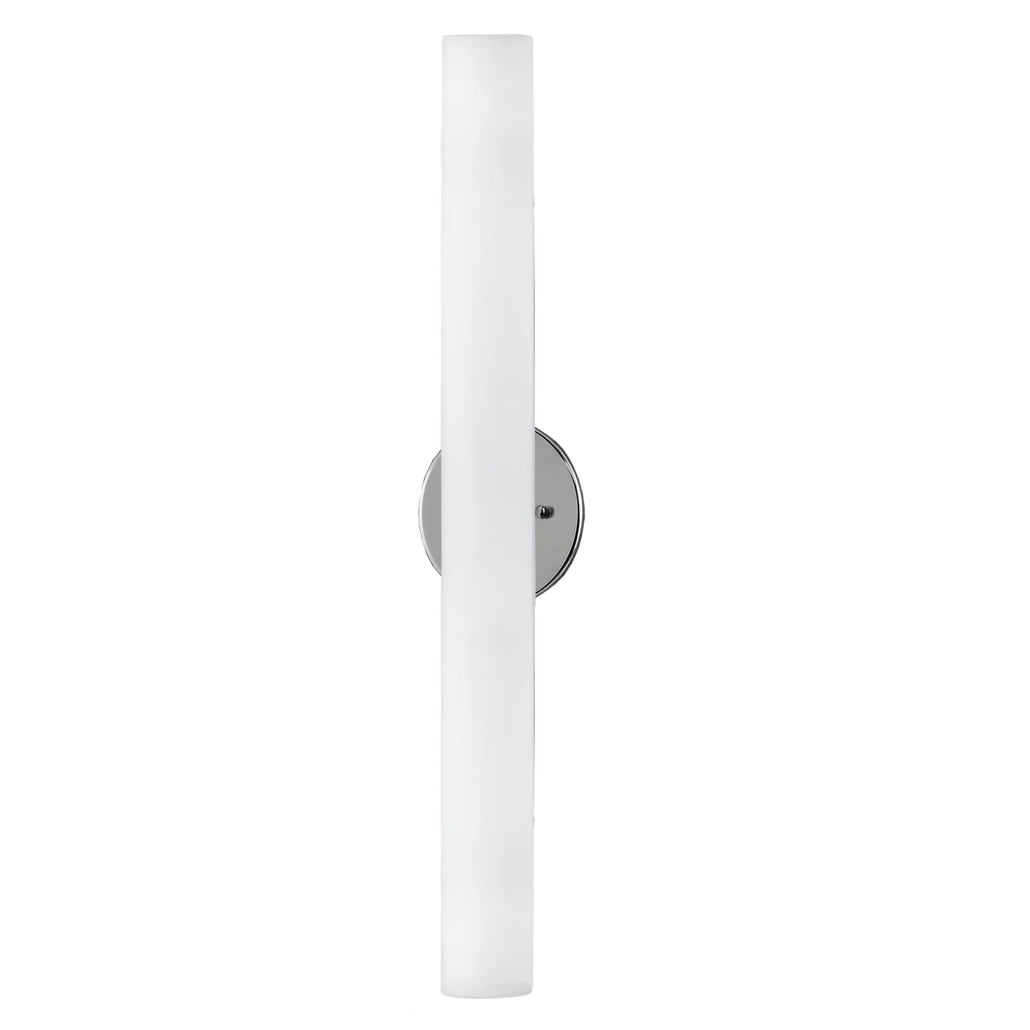 Single LED wall sconce with cylinder shaped white opal glass. Metal details in brushed nickel or chrome finish and is equipped with our powerful 120V AC LED technology.