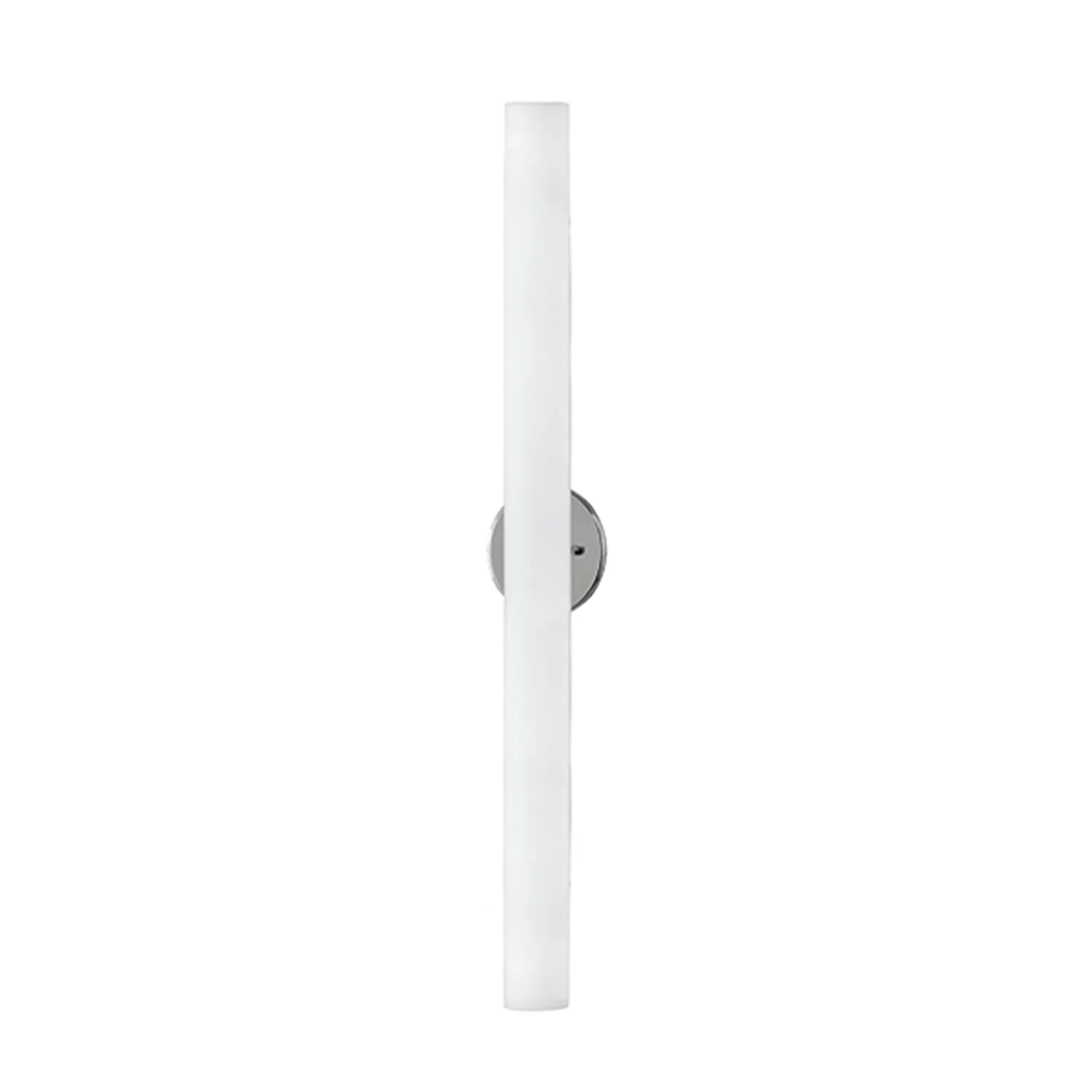 Single LED wall sconce with cylinder shaped white opal glass. Metal details in brushed nickel or chrome finish and is equipped with our powerful 120V AC LED technology.