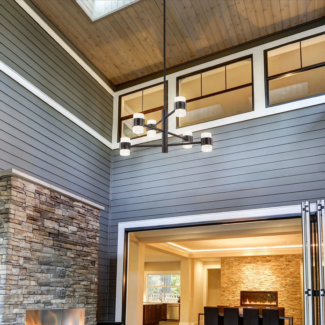 The stark yet refined finish of the black structure contrasts with the translucent glass to augment its effect. Available in both wall-mounted and chandelier configurations, the complete offering is both elegant and versatile.