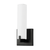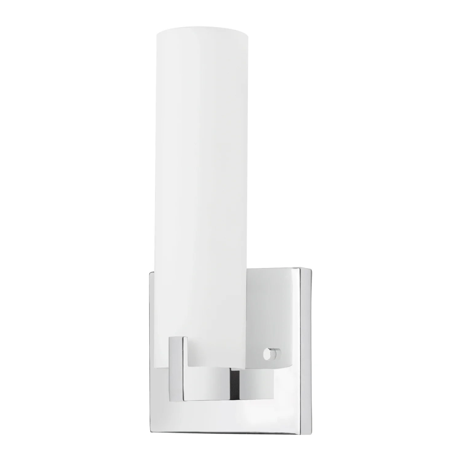Single lamp LED wall sconce with white opal glass cylinder, metal details in black, brushed golf, brushed nickel or chrome finish and is equipped with our powerful 120V AC LED technology.