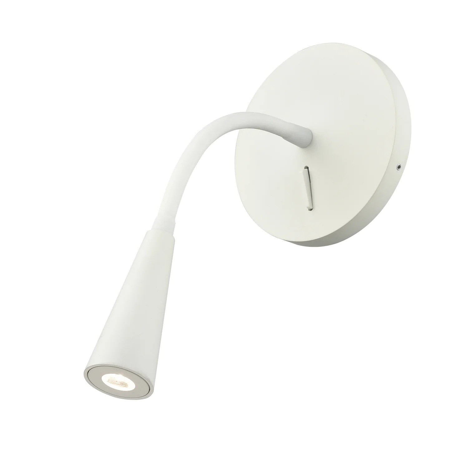 Die-cast aluminum lamp head with flexible rubberized stem. Circular wall mount attachment. Finely textured powder-coated finish. Adjustable direction spotlight. Rocker on/off switch.