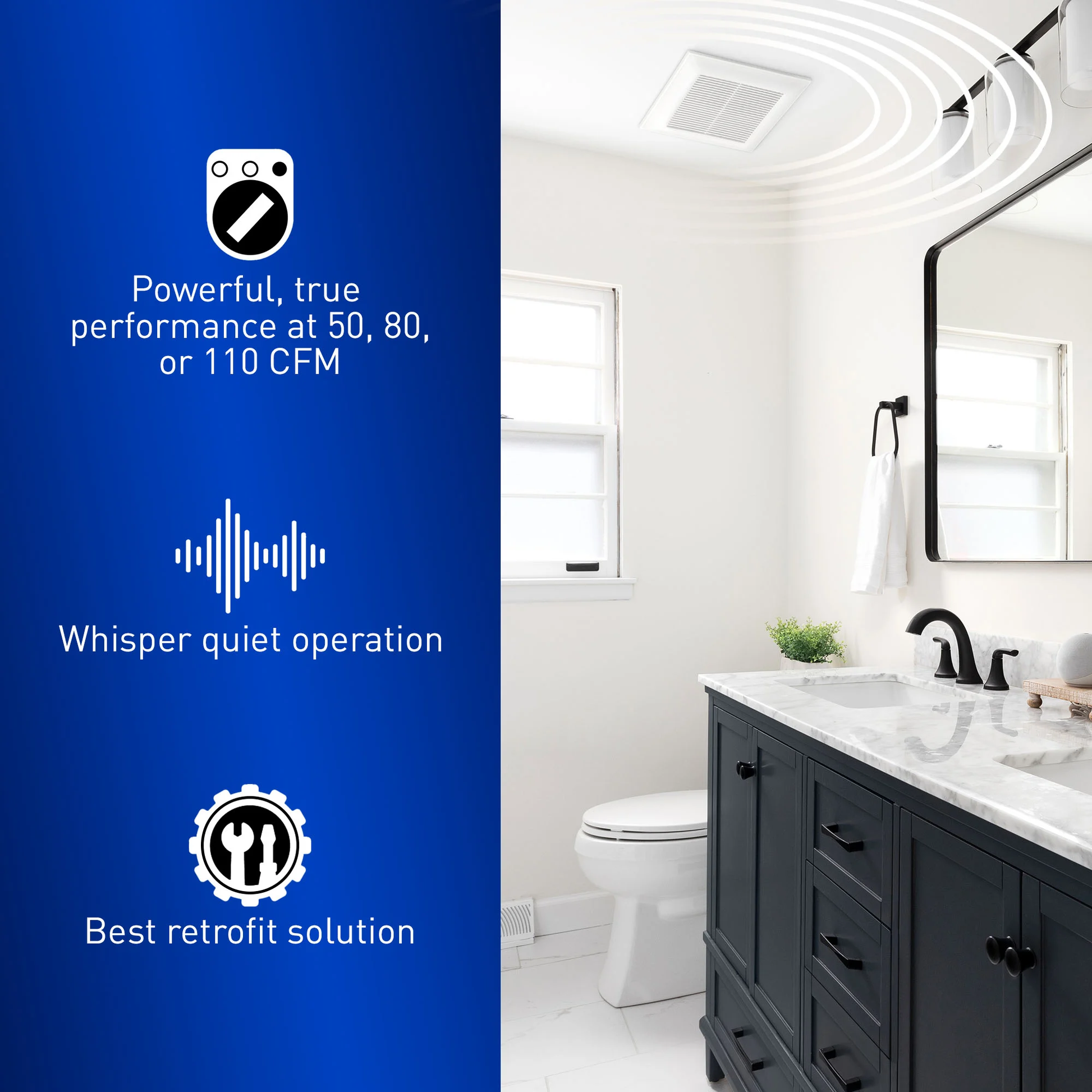 Built-in Pick-A-Flow® airflow selector allows you to select your required airflow of 50, 80, or 110 CFM with a simple flip of a switch