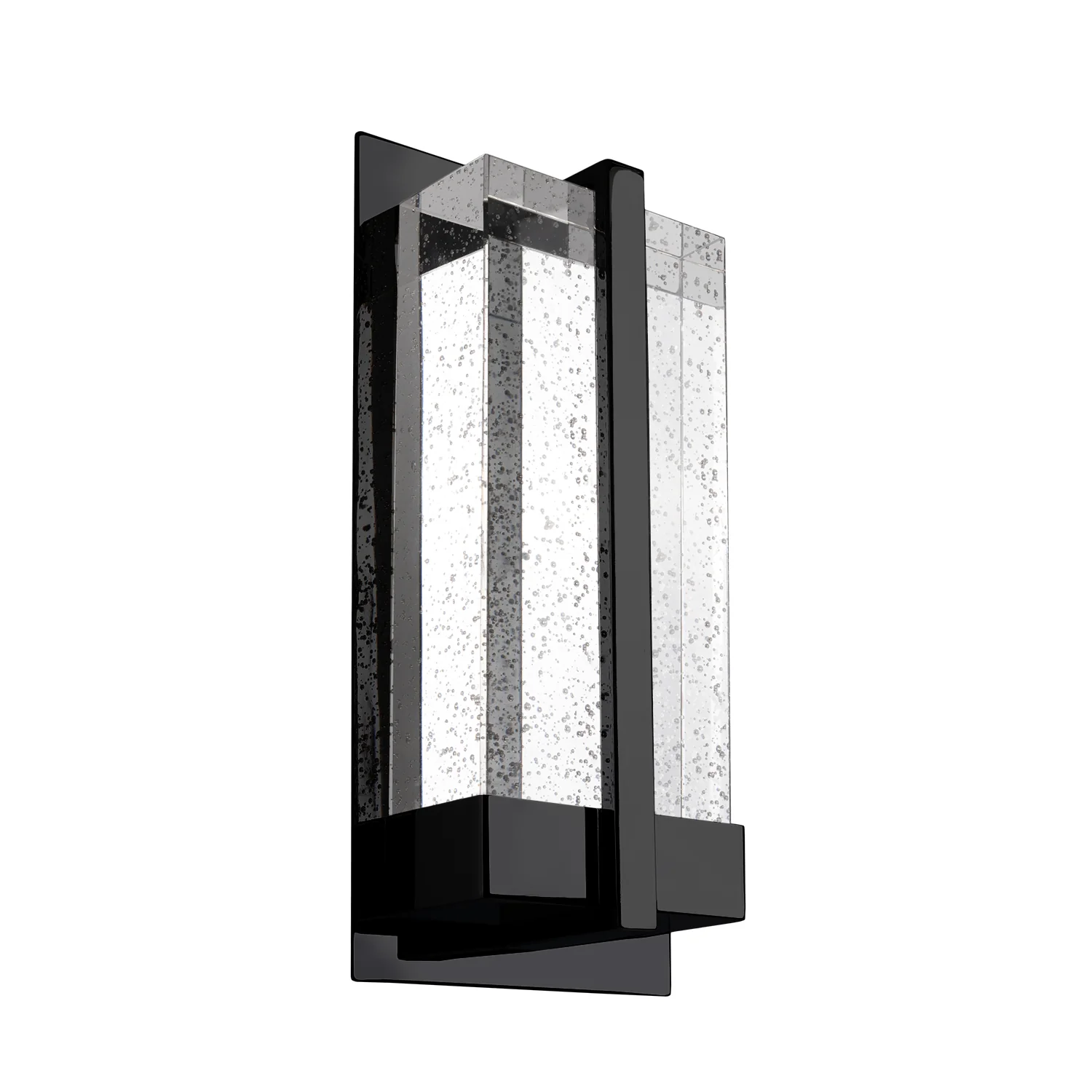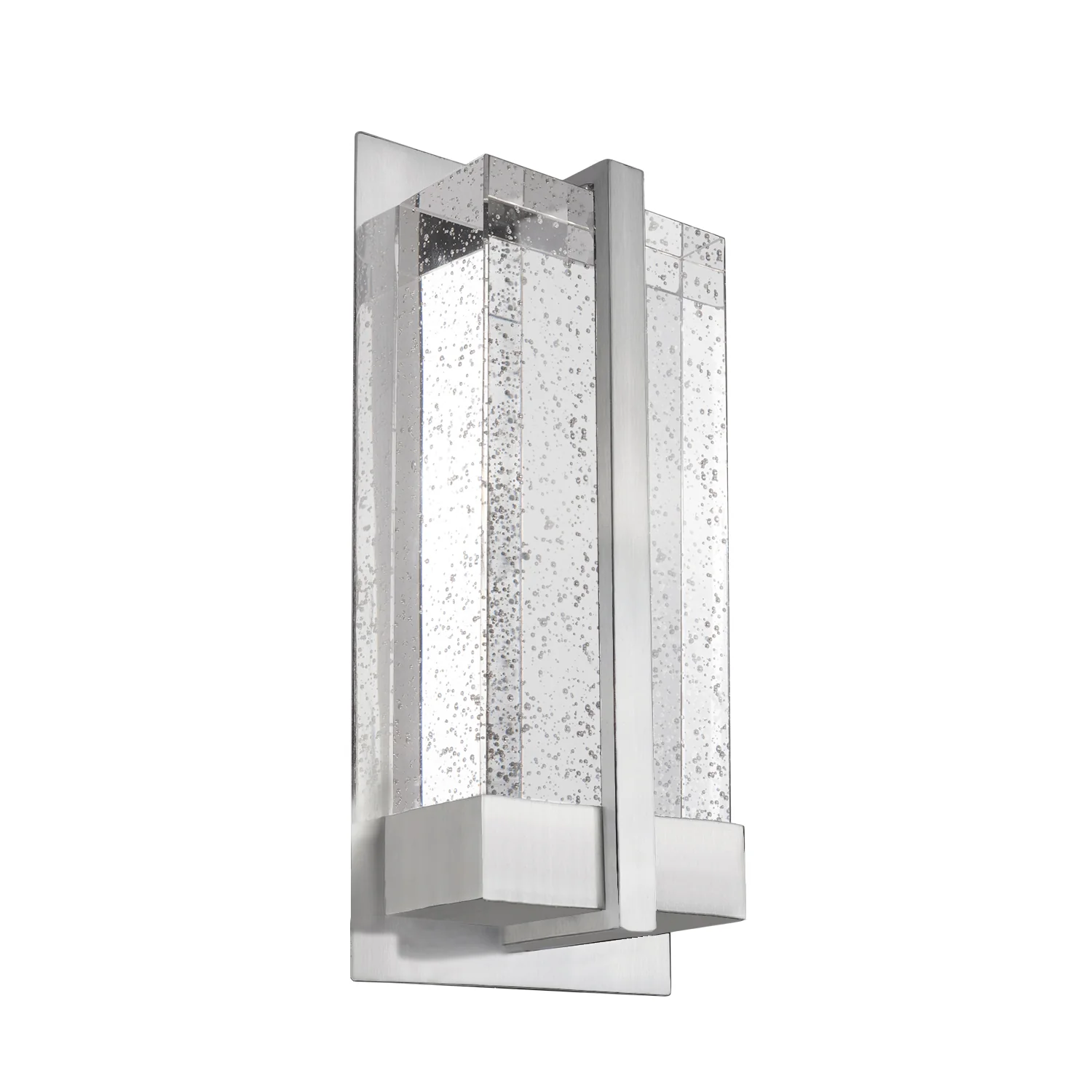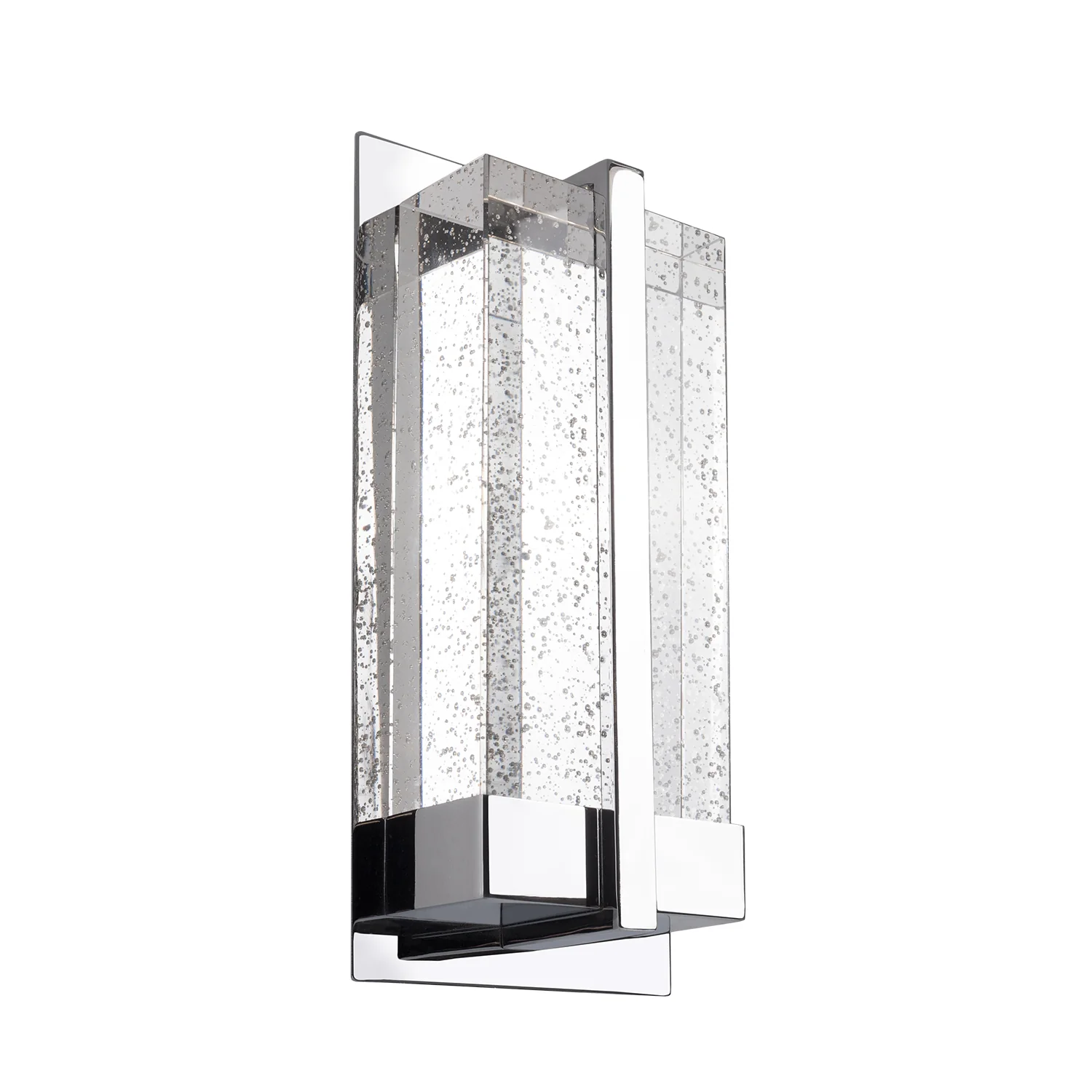 This intensive LED wall sconce is one of a kind. Build with heavy gauged steel, plated in two finishes brushed nickel or polished chrome. With a solid rectangular bubble encased crystals which sits directly above LED board. When lit the crystal expels the light with beautiful patterns on the wall and around the room. Equipped with our powerful 120V AC LED technology.
