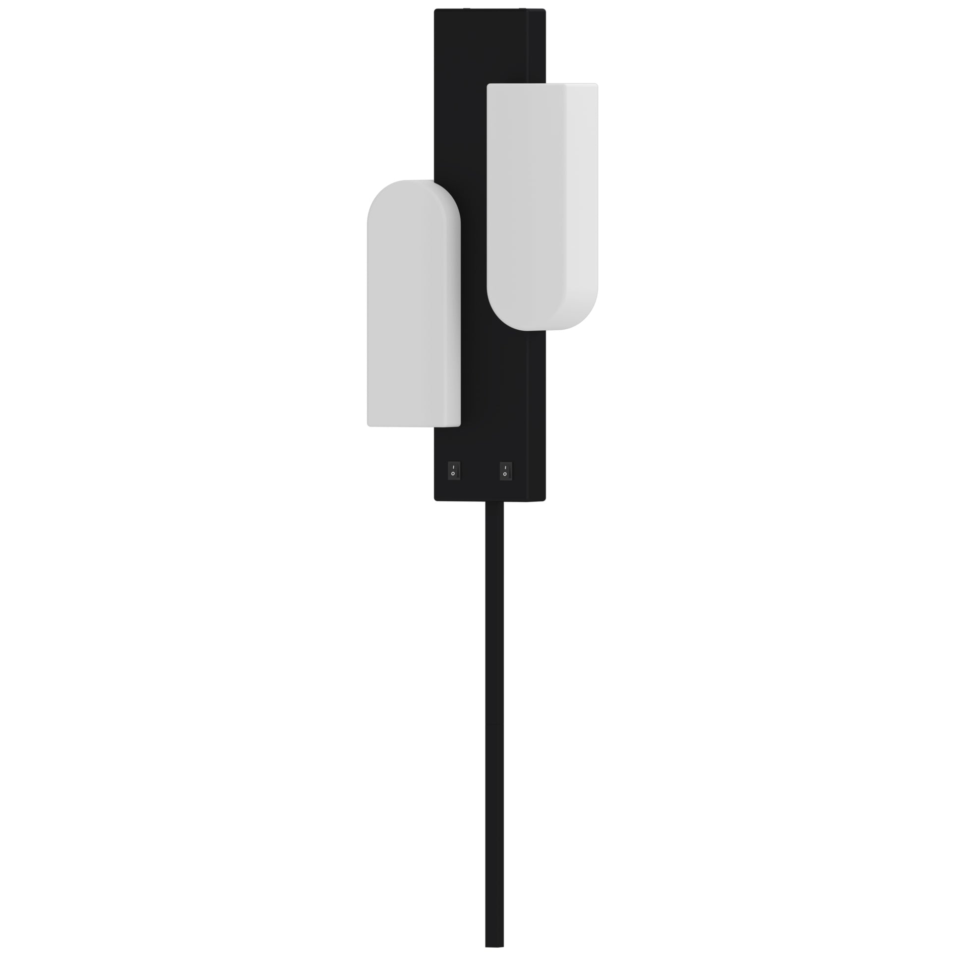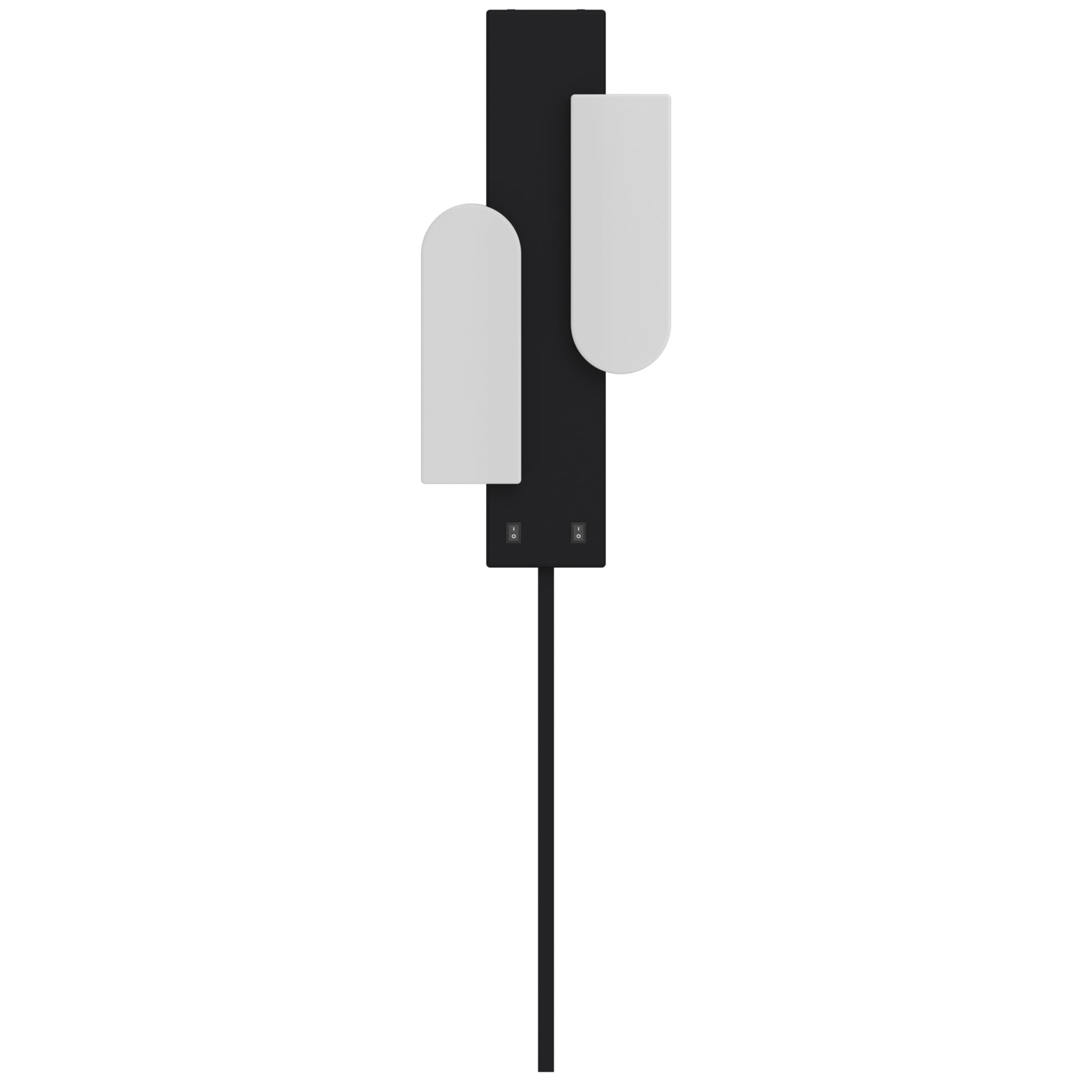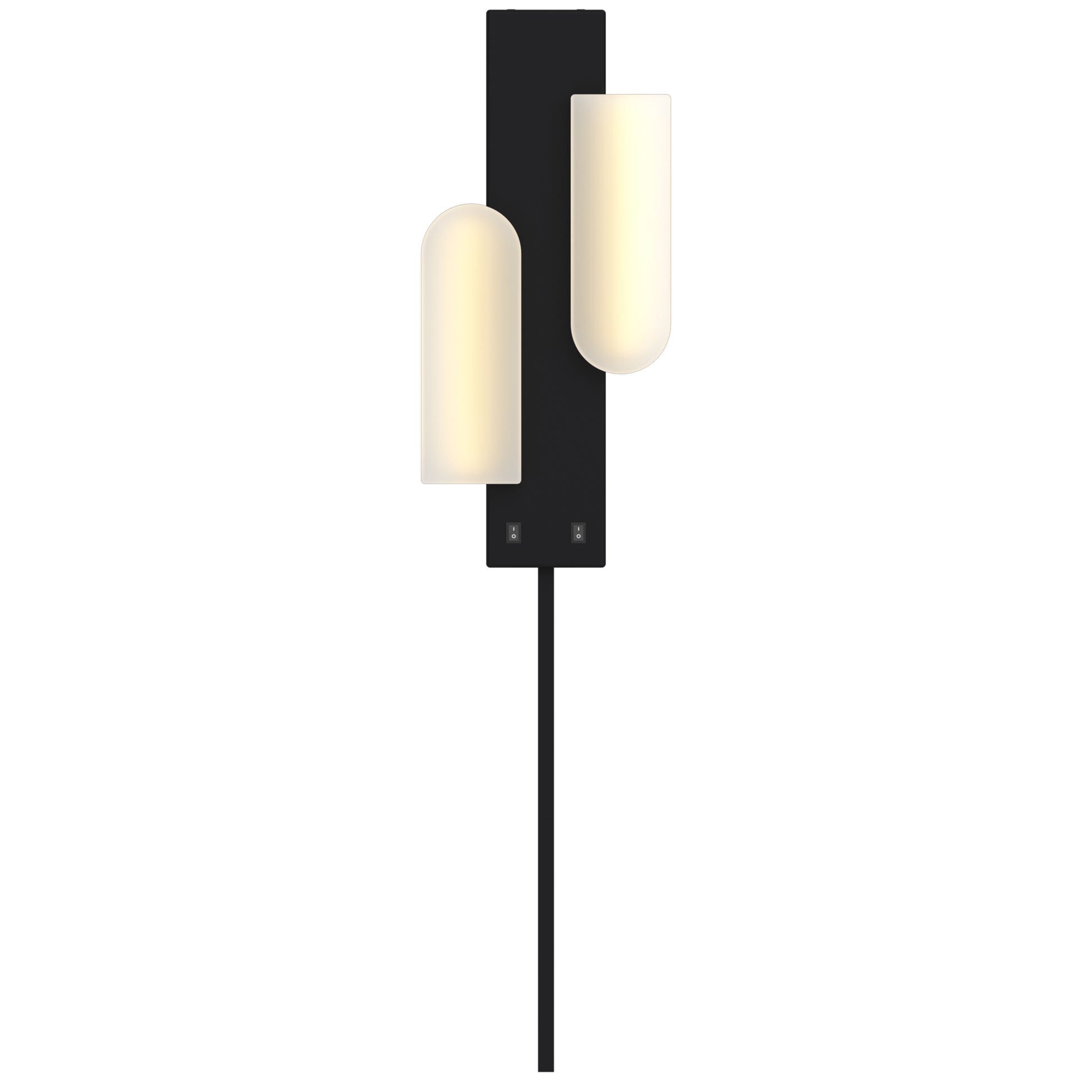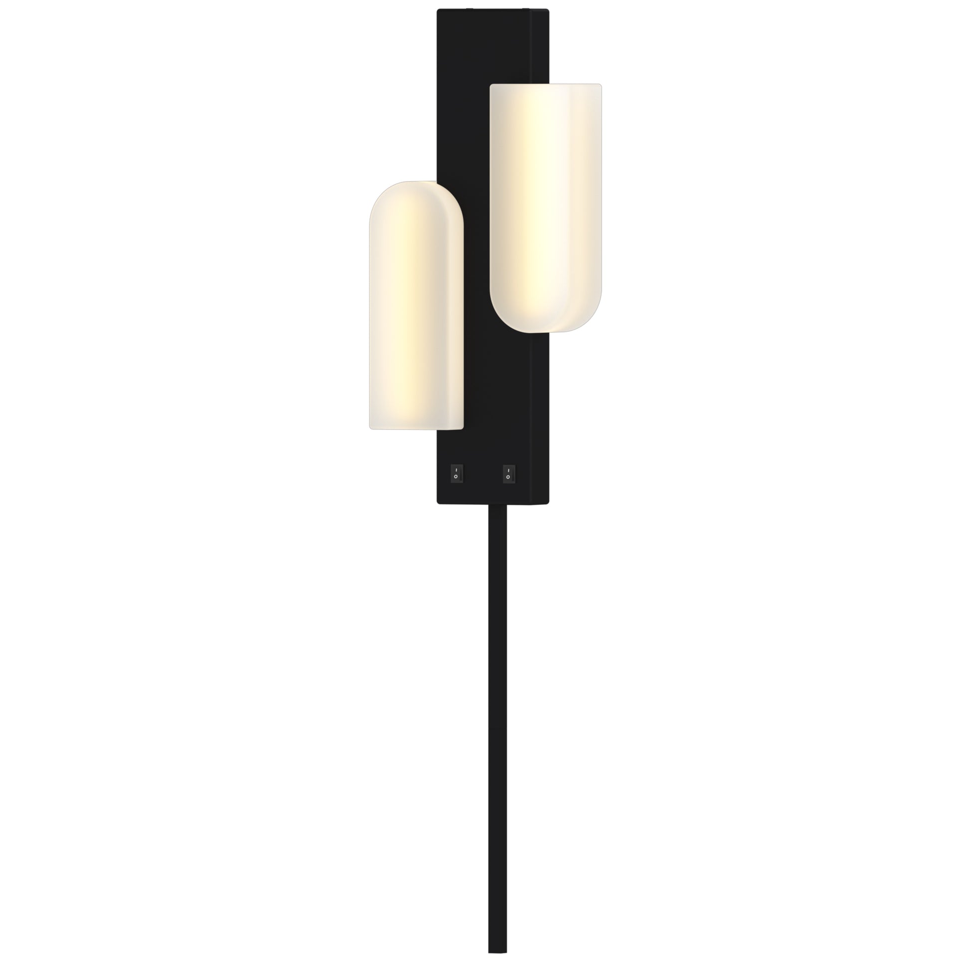 This queen headboard sconce has a matte black finish with metal and acrylic shades.