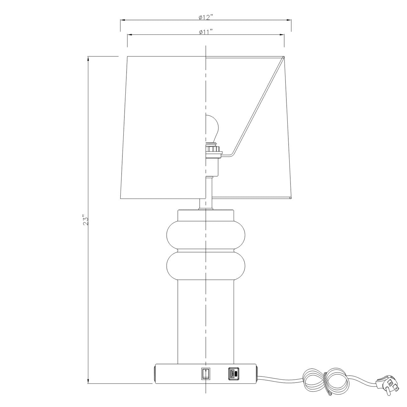 The prototype approved nightstand table lamp for guestrooms at bedside. It is a cylinder style, graphite black matte finish lamp with ring accents, and a white linen wrapped top shade. It comes with (2) outlets (1) USB-A and (1) USB-C in the Sparkle silver base. It is commercial quality and UL listed for safety and comes with a standard 1-year warranty.