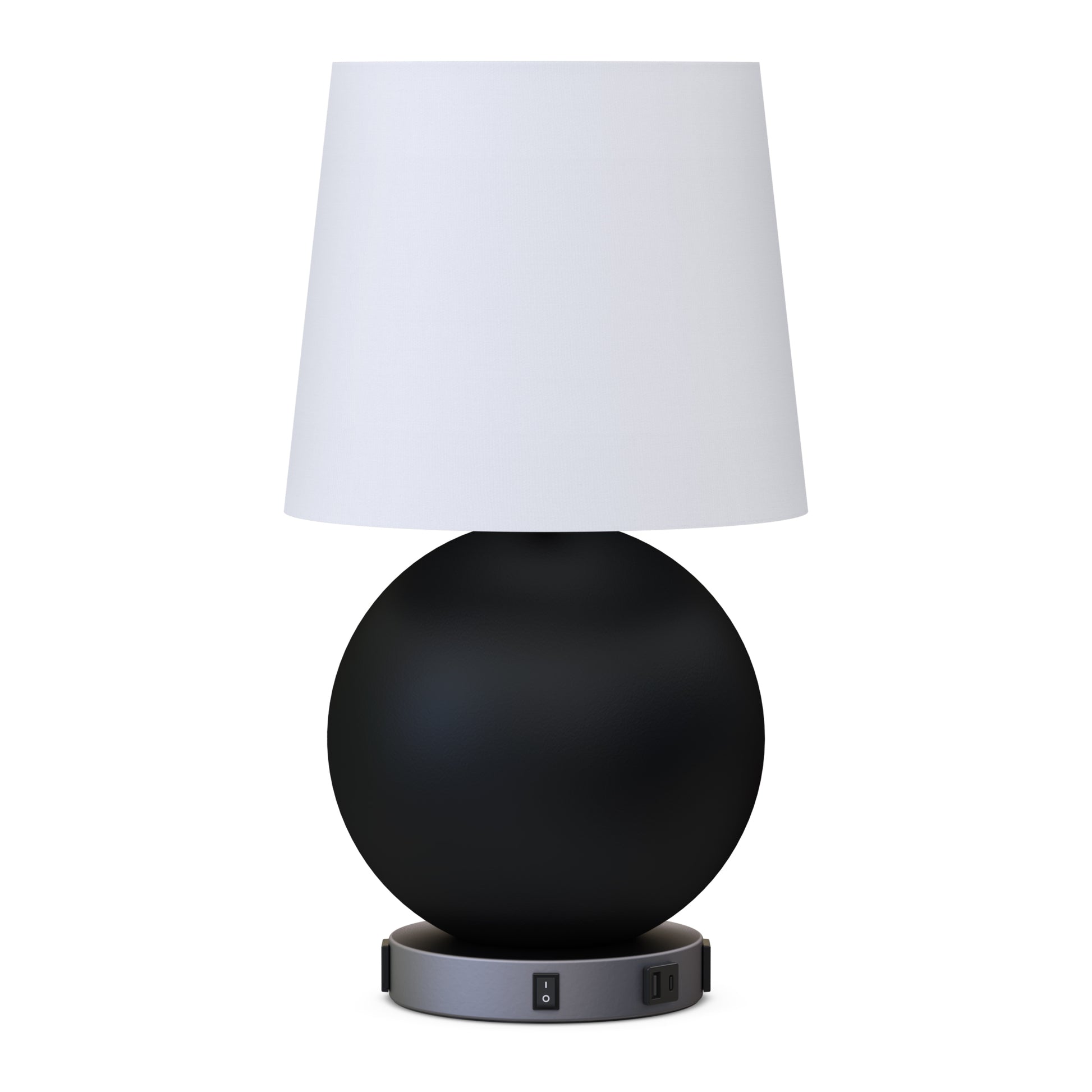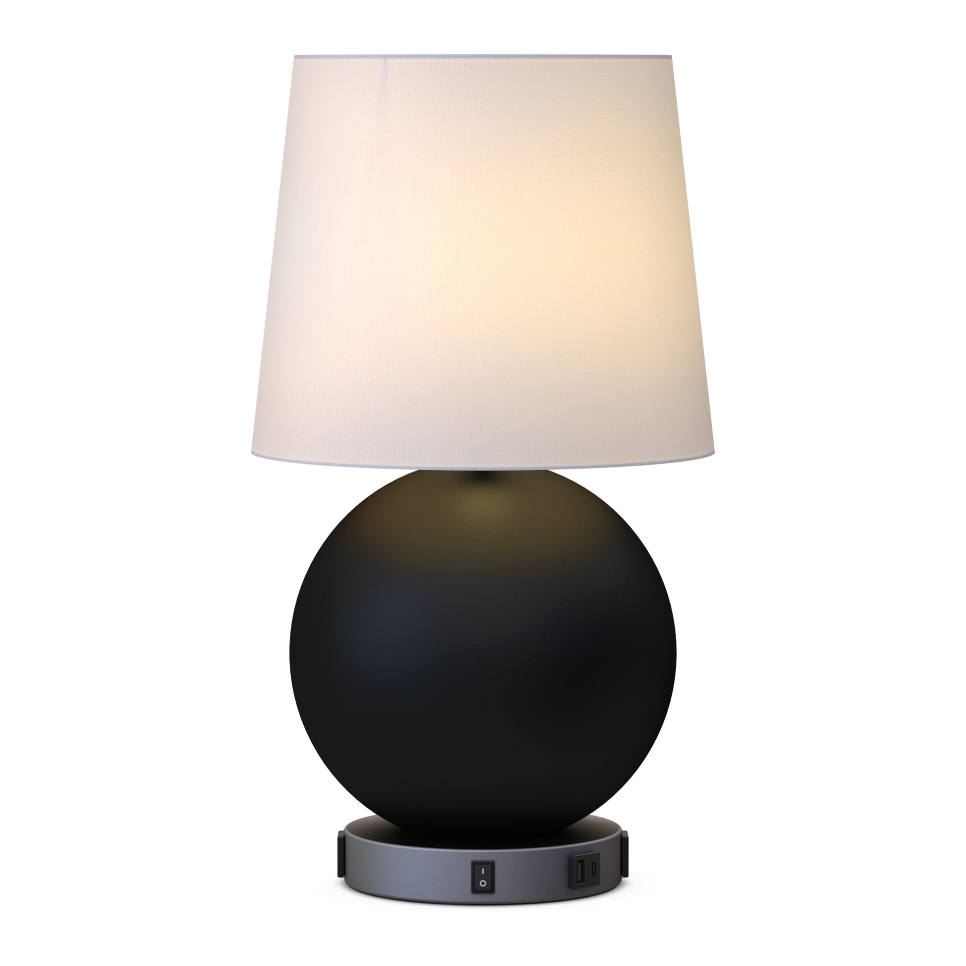 The prototype approved round side table lamp at guestroom sofa. It is a round graphite black table lamp with round silver base and tapered white linen wrapped shade. It comes with (2) outlets (1) USB-A and (1) USB-C in the Sparkle silver base. It is commercial quality and UL listed for safety and comes with a standard 1-year warranty.