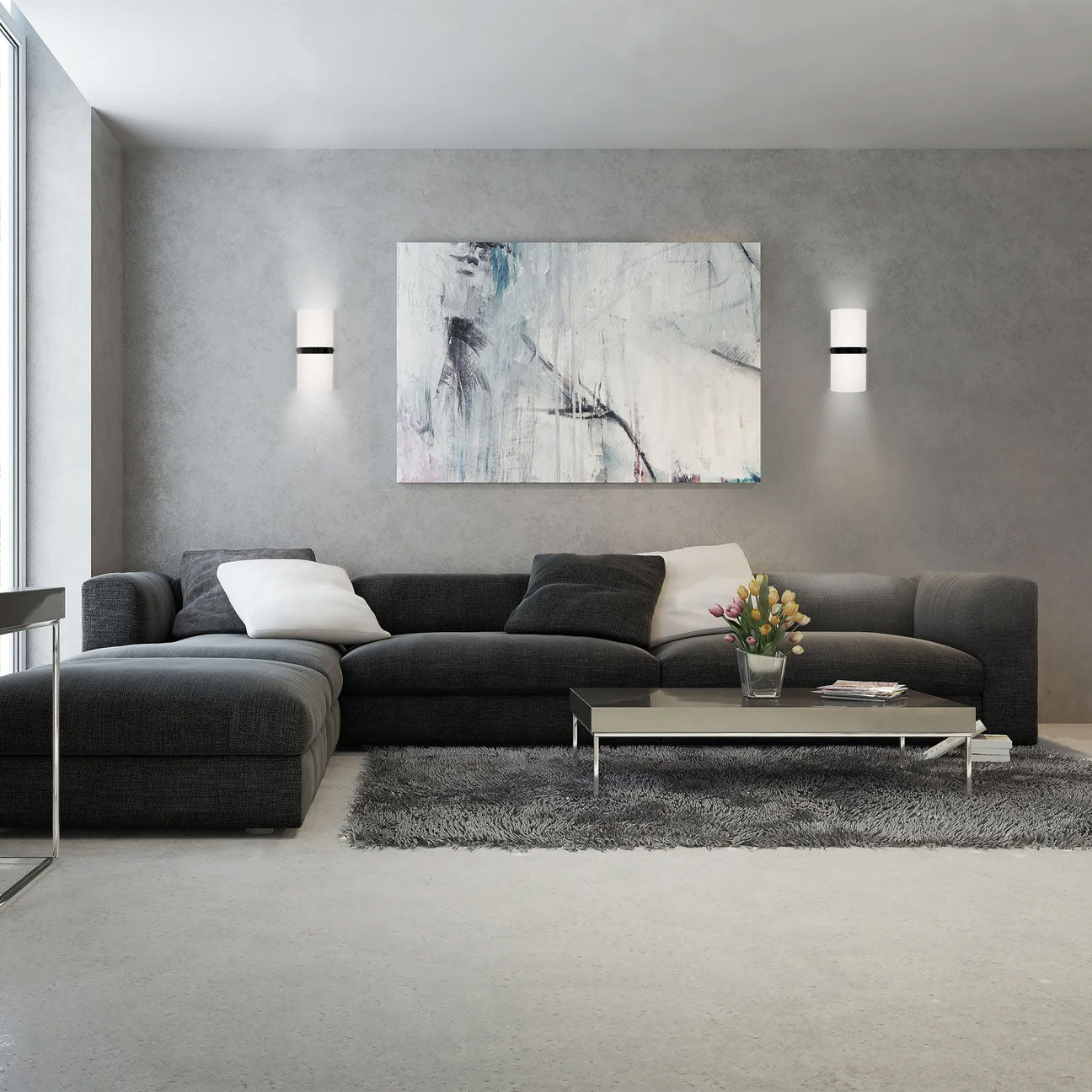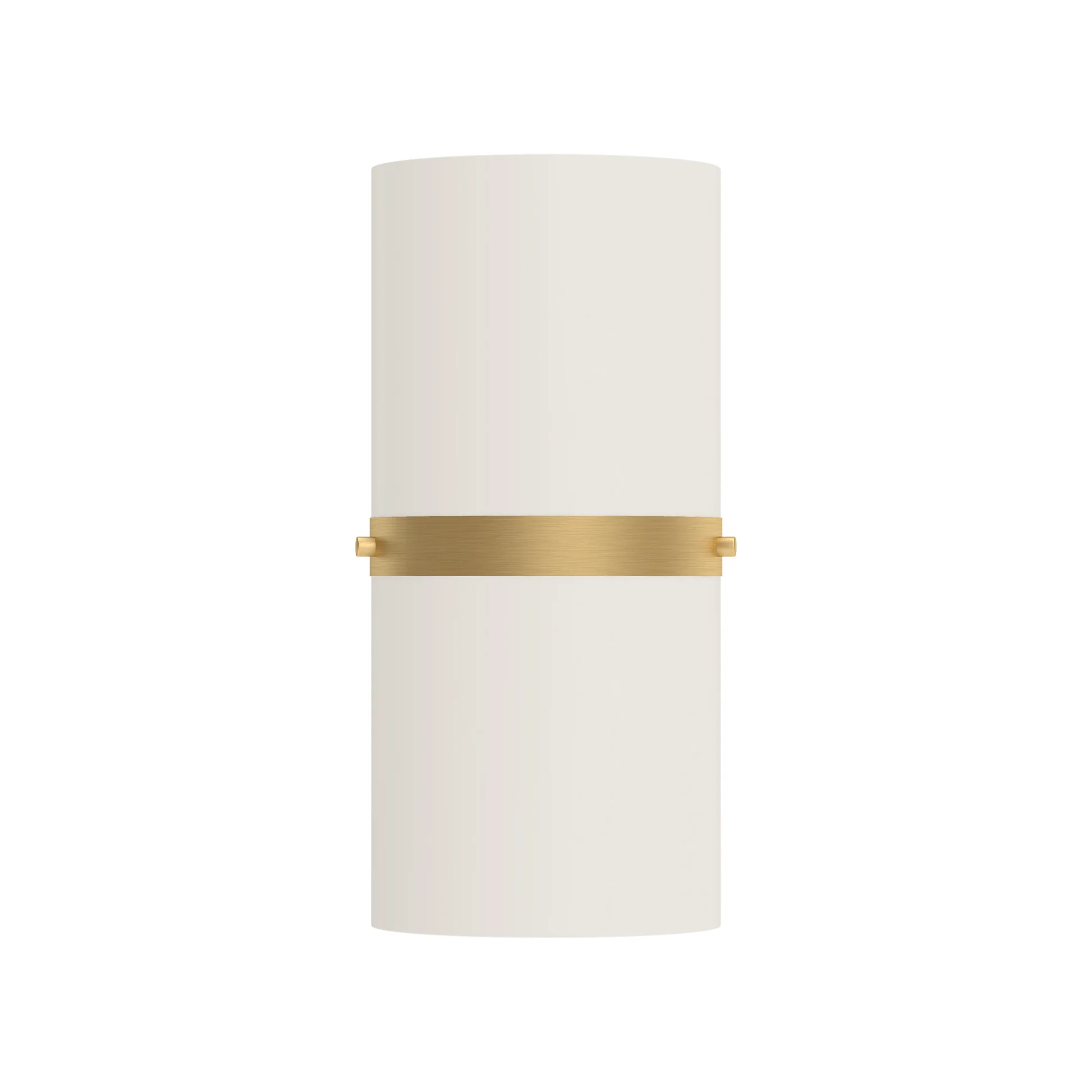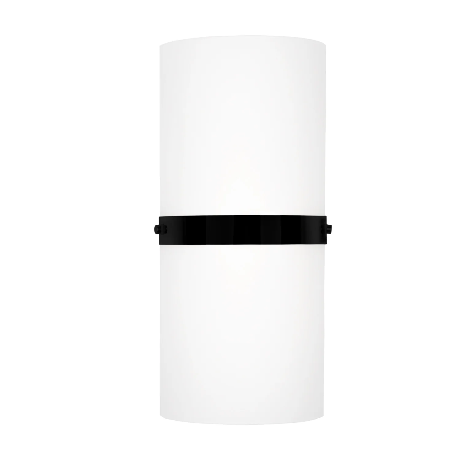 Single LED wall sconce with half cylinder-shaped white opal glass and chrome, brushed gold, or black band detail. Equipped with our powerful 120V AC LED technology.