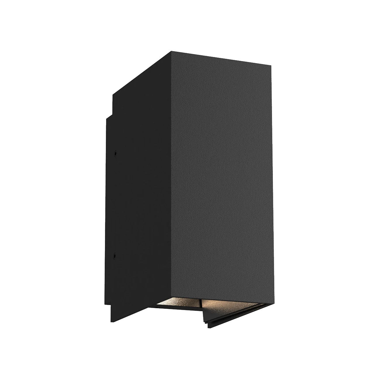 Architectural exterior wall sconce, die-cast rectangular aluminum body with two adjustable flaps to change beam angle above and below the fixture