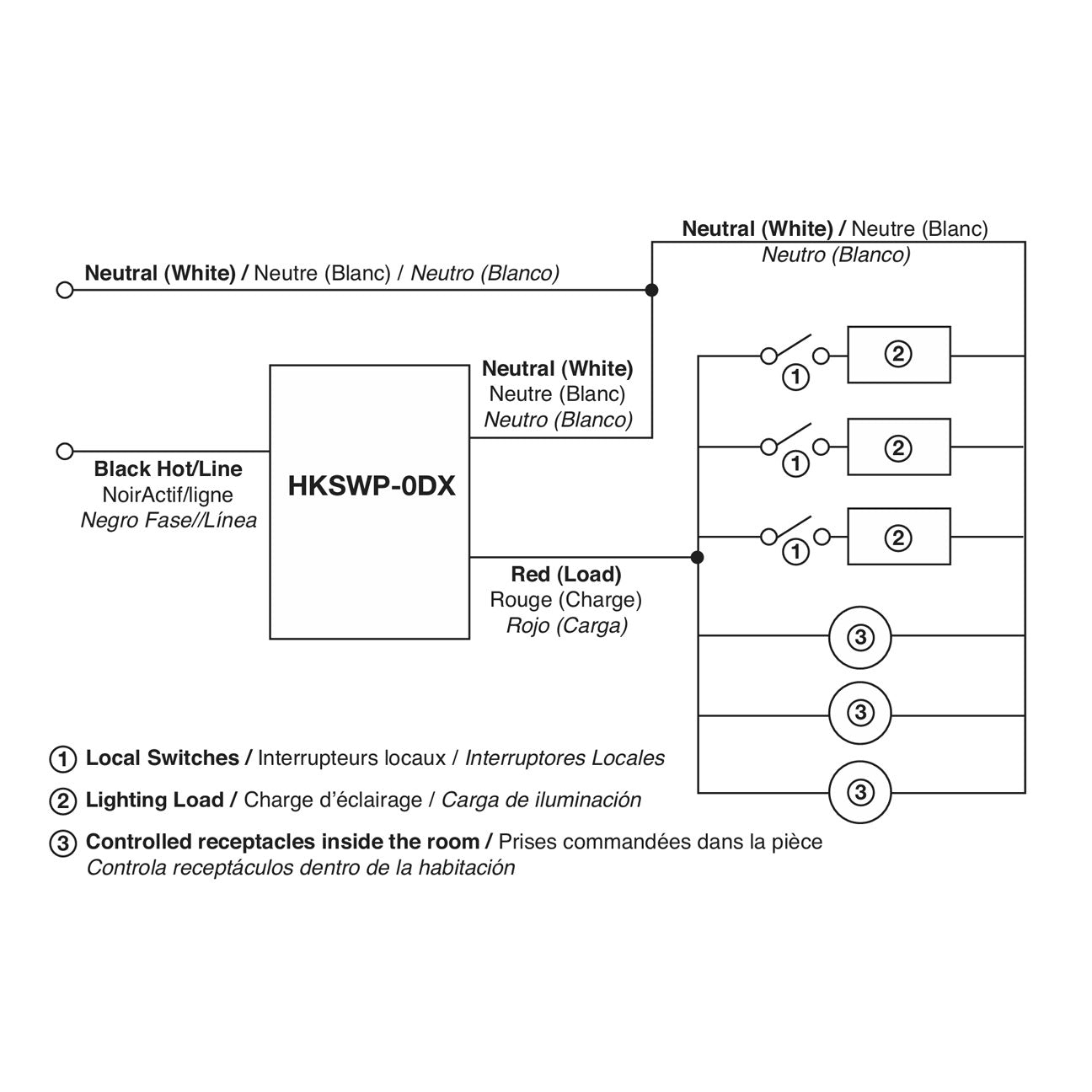 The Key Card switch operates by insertion and/or removal of a key card similar to those used in hotels. When the key card is inserted in the slot, an optical beam is interrupted by the card, signaling the circuitry to switch the load ON. When the card is removed, the optical beam is restored, and a countdown timer is initiated. After approximately 30 seconds for the timer expires and the loads are switched OFF. This delay ensures that the user can safely exit the room prior to the lights turning OFF. To assist in locating the switch when the user enters a dark room, the card slot is illuminated by low energy LEDs. When a card is inserted in the slot, the LEDs are switched OFF.