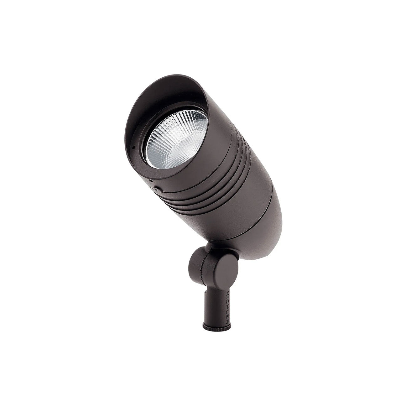 The Kichler DLC® Listed C-Series 21W, 55-degree Commercial Outdoor large accent light is an integrated LED fixture that features 120V-277V Universal voltage with built in surge protection and is rated for wet locations. Featuring an integrated cowl, durable knuckle construction, and an all-metal housing with a textured polyester powder coat finish (shown here in Textured Architectural Bronze), it is designed for high use wear and tear.