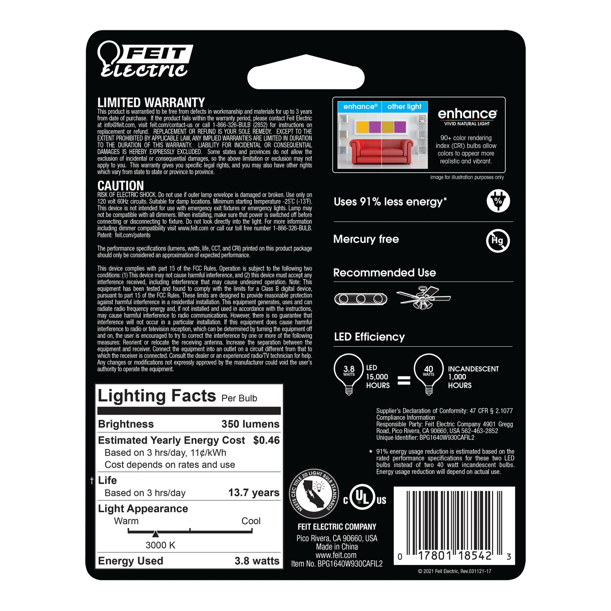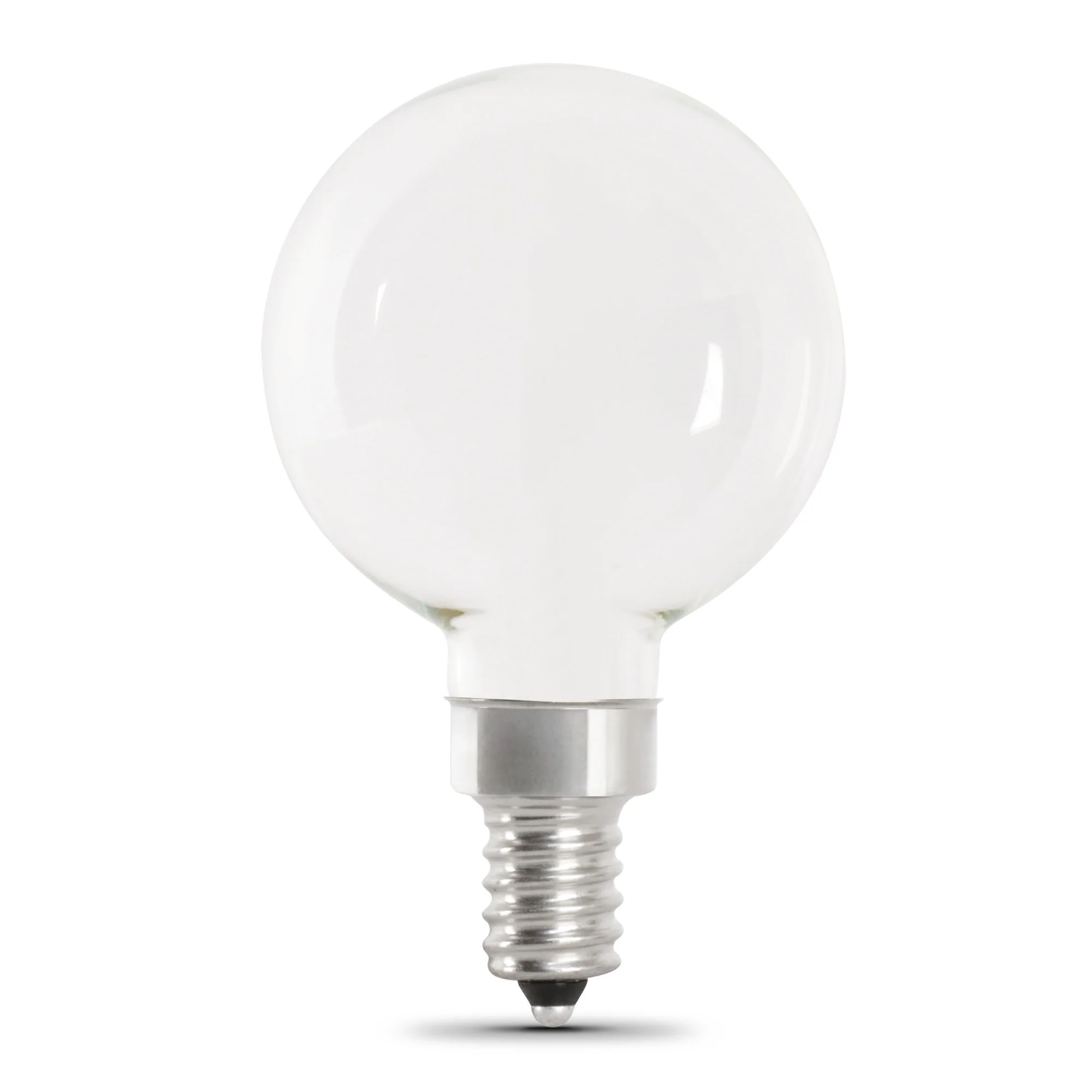 Combine the vintage glass filament lighting look and feel with the advantages of modern LED technology with these stylish light bulbs from Feit Electric. Energy-efficient LEDs replace a 40-watt incandescent, producing a 3000K Bright White glow that gives the home a cozy feel. A frosted G16 1/2 mini-globe design with exposed filament wrapped in frosted glass housing is ideal for chandelier fixtures and will enhance the décor of any room. Enhance 90+ CRI light makes colors vibrant and skin tones more natural, all while saving energy and lasting for decades.