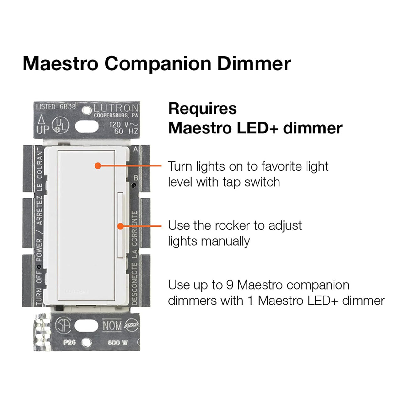 For Use with Maestro Multi-Location dimmer switches only. Companion dimmer switches allow you to dim from either end of a room or hallway. Use up to nine companion dimmers with only one Maestro Multi-Location dimmer switch.