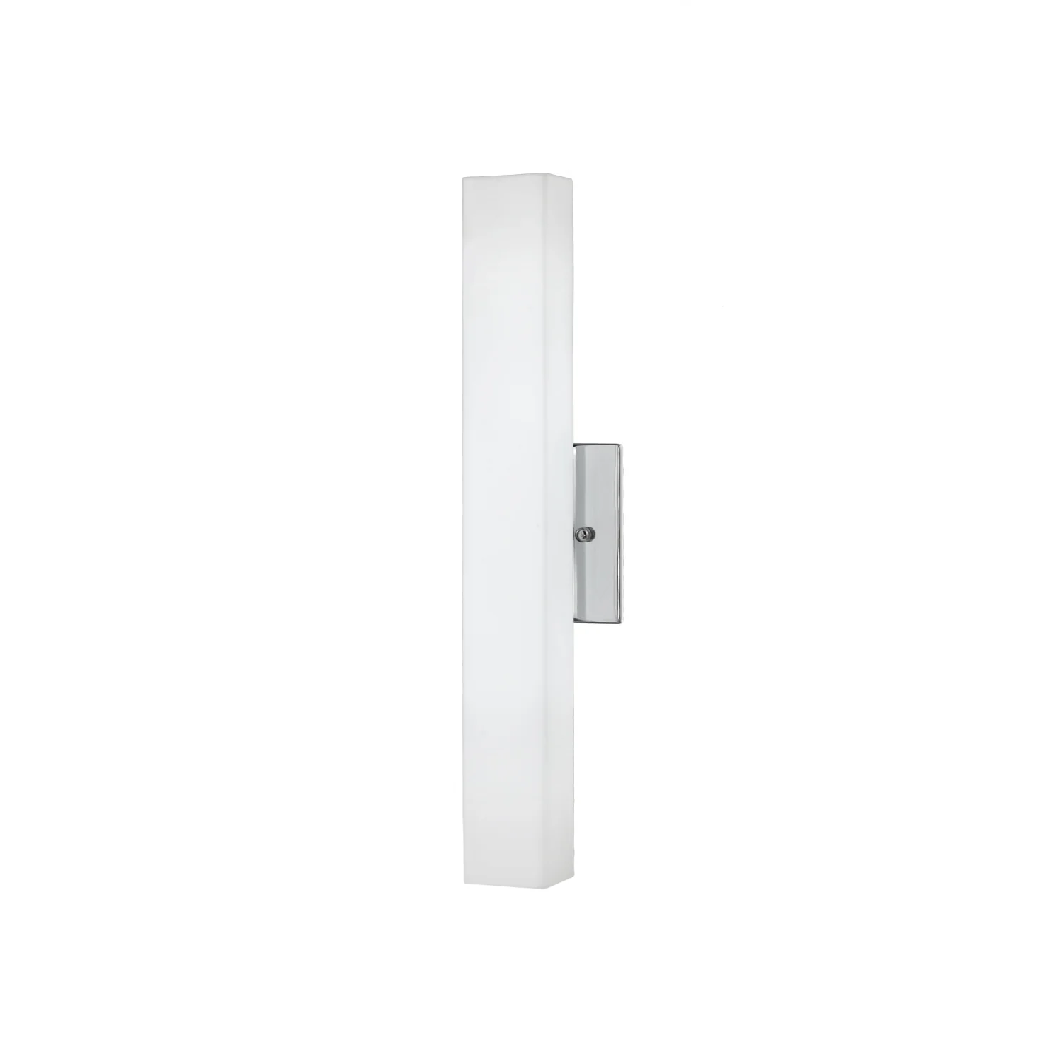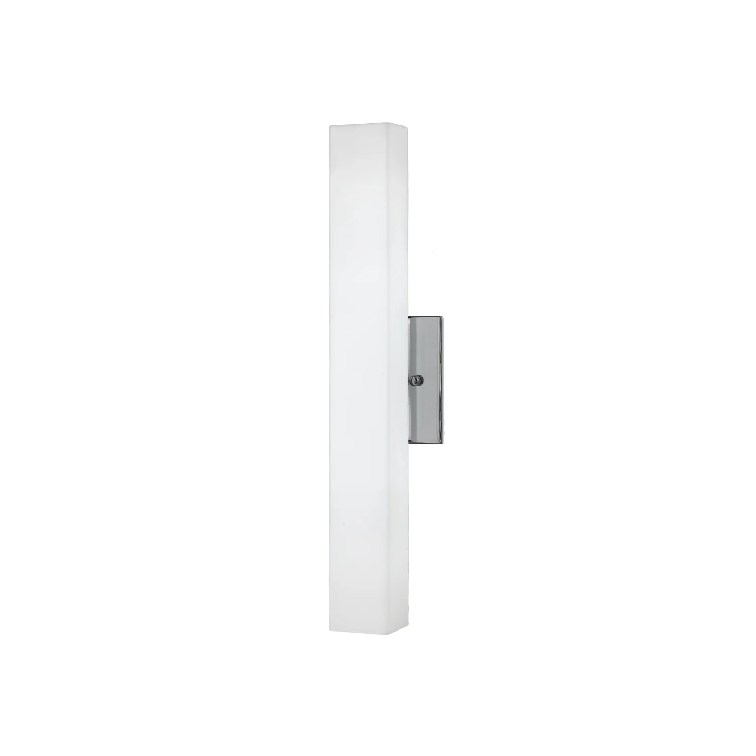 Single LED wall sconce with rectangular shaped white opal glass. Metal details in brushed nickel or chrome finish and is equipped with our powerful 120V AC LED technology.