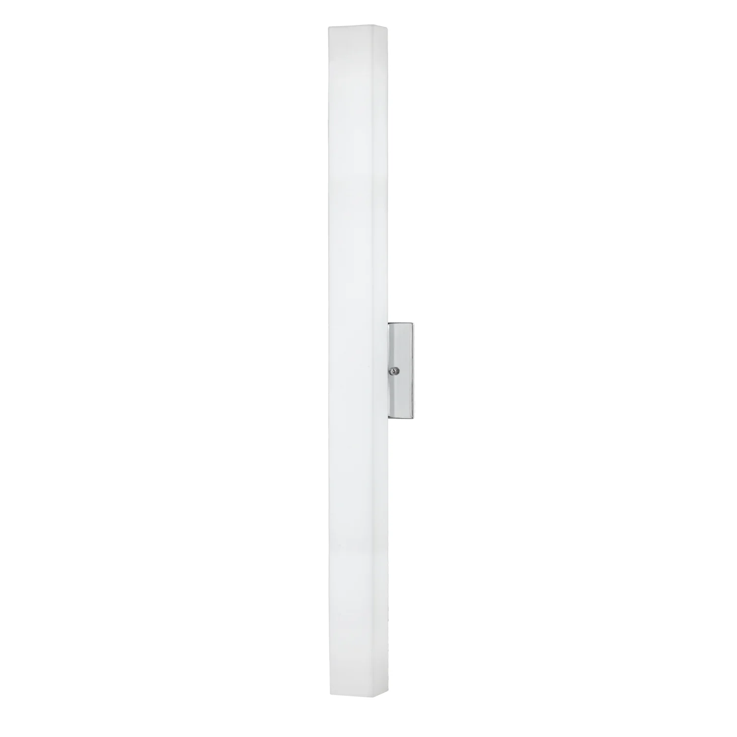 Single LED wall sconce with rectangular shaped white opal glass. Metal details in brushed nickel or chrome finish and is equipped with our powerful 120V AC LED technology.