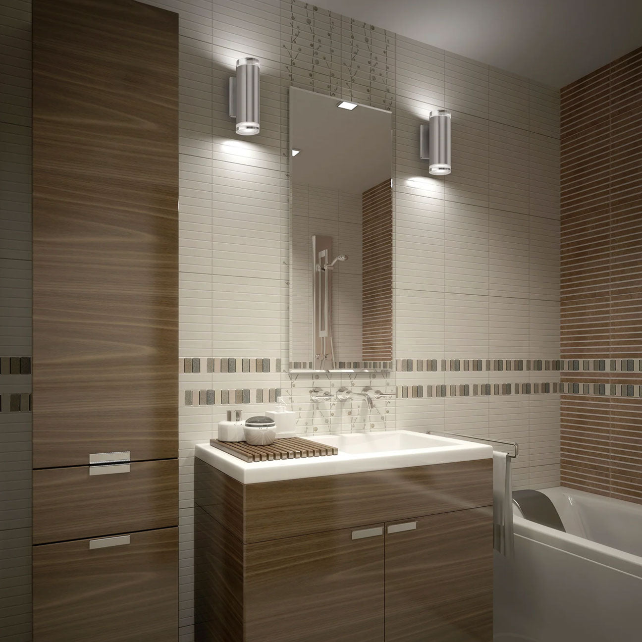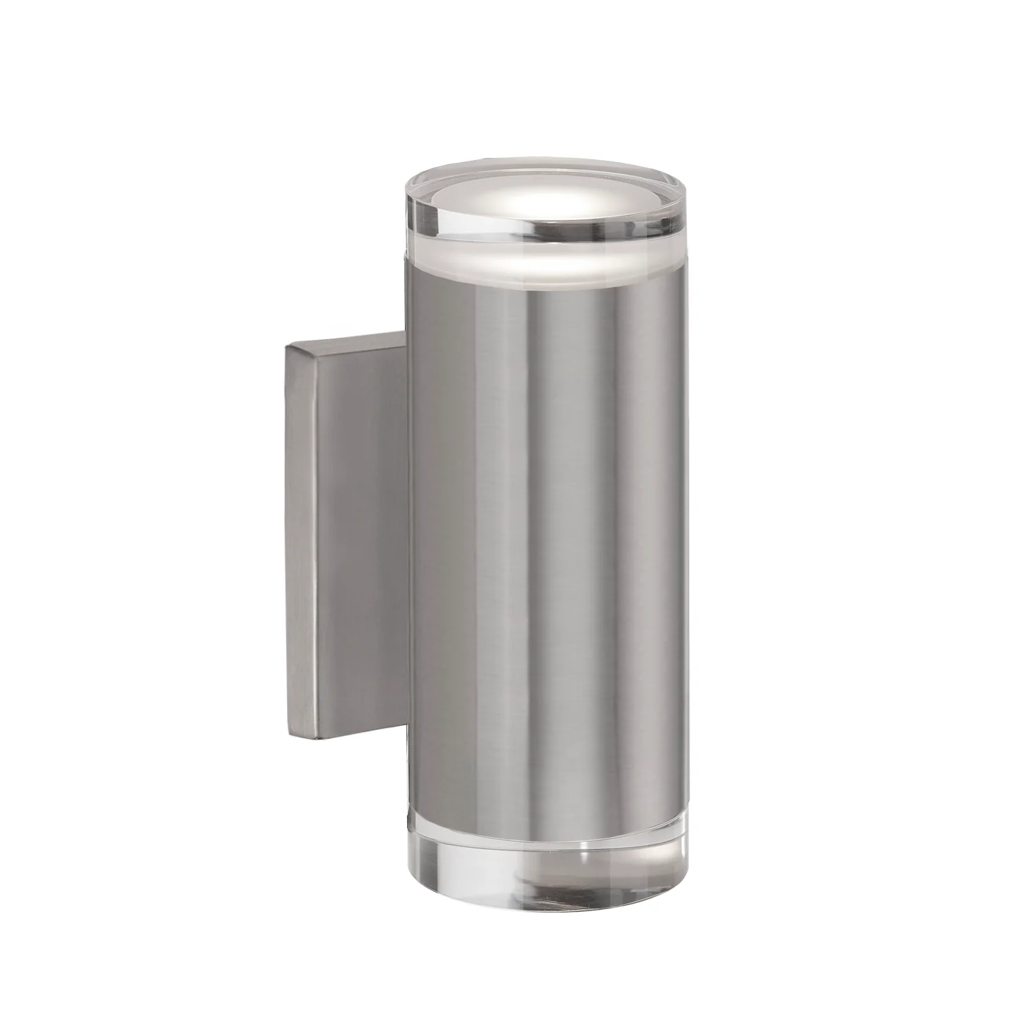 LED cylinder shaped up/down wall sconce with glass discs. Metal details in black, brushed gold, brushed nickel or chrome finish, and is equipped with our powerful 120V AC LED technology.