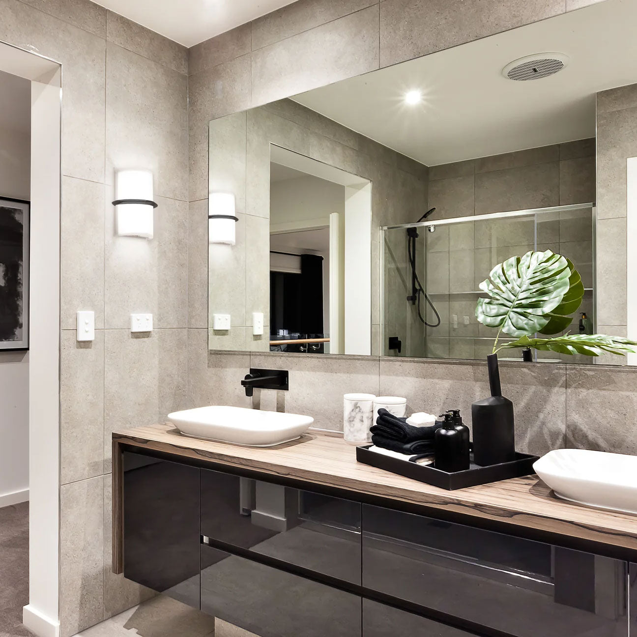 - Horizontal plated or painted steel accent and wall plate