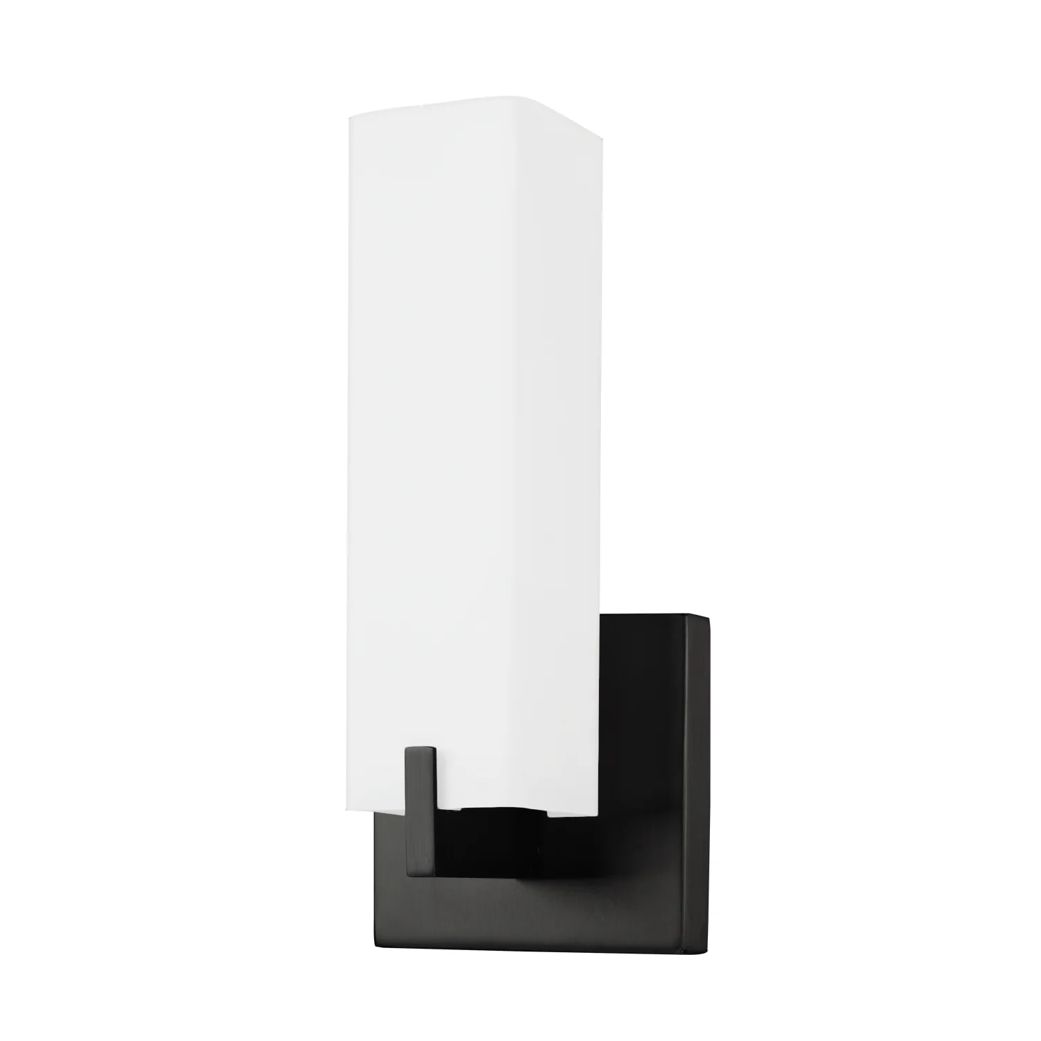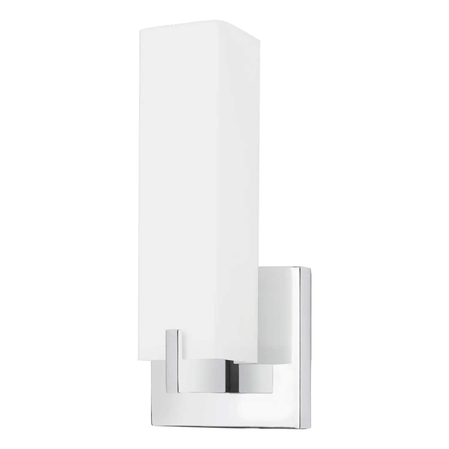 Single lamp LED wall sconce with square shaped white opal glass, metal details in brushed nickel or chrome finish, and is equipped with our powerful 120V AC LED technology.