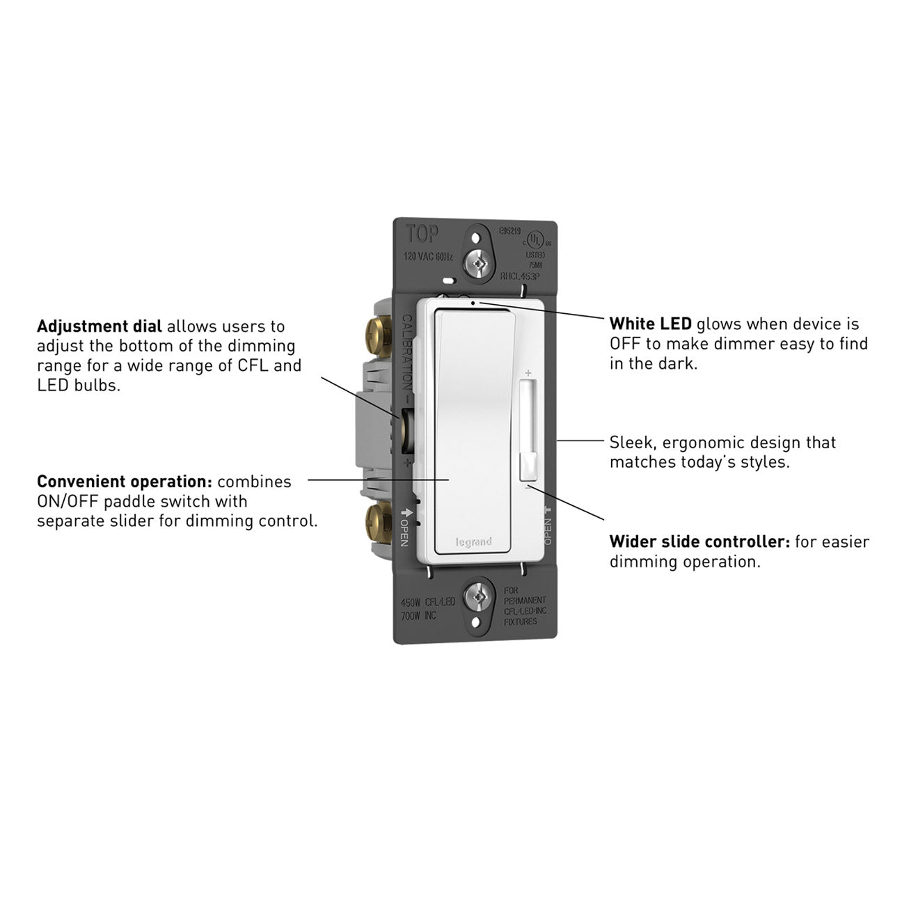 - Adjustment dial allows users to adjust the bottom of the dimming range for a broad selection of CFL and LED bulbs.