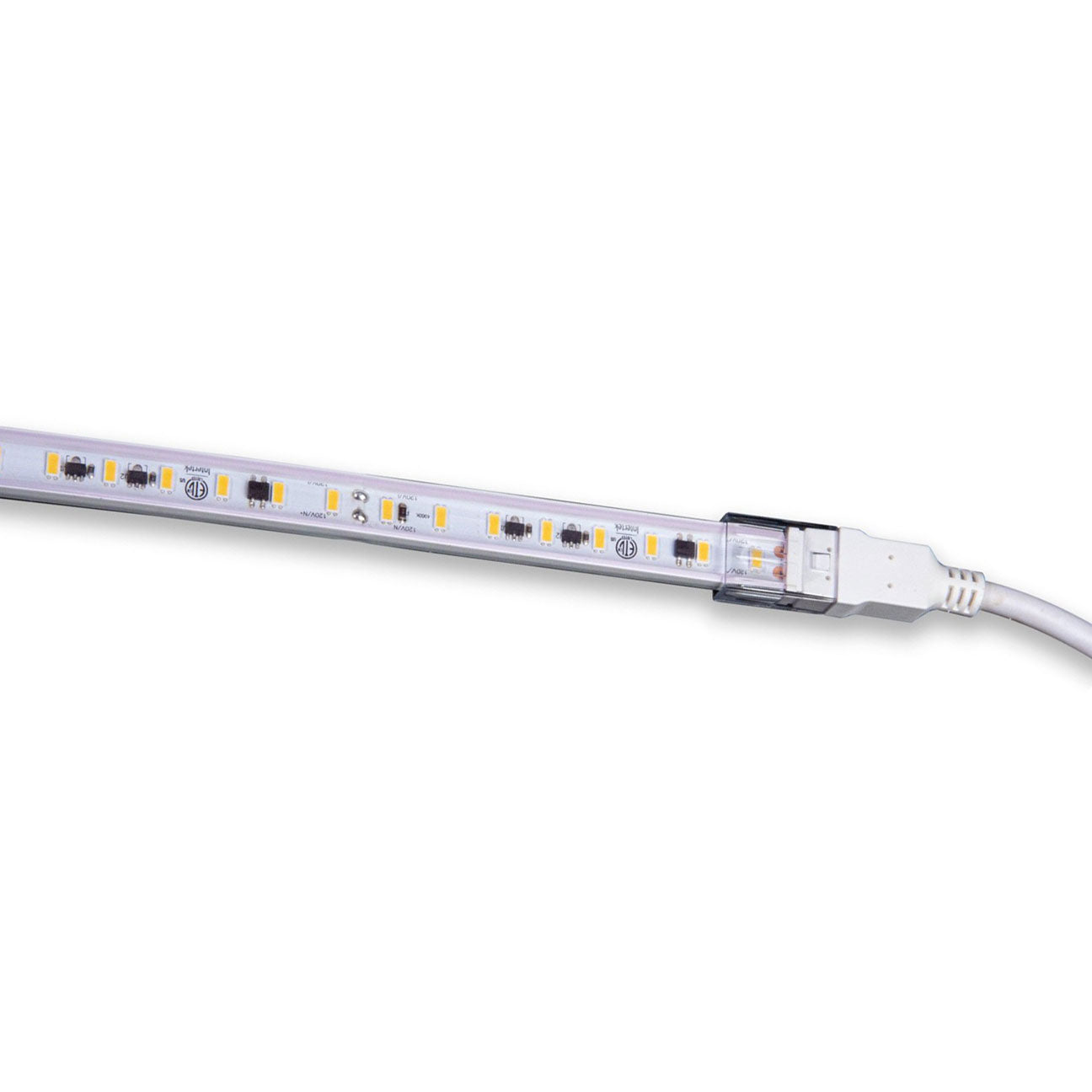 A standard output, wet location flexible 120V plug-in or hardwire LED linear tape for architectural coves, indoor steps, bannisters, exterior recesses and other constructs where even, energy saving LED illumination is specified.