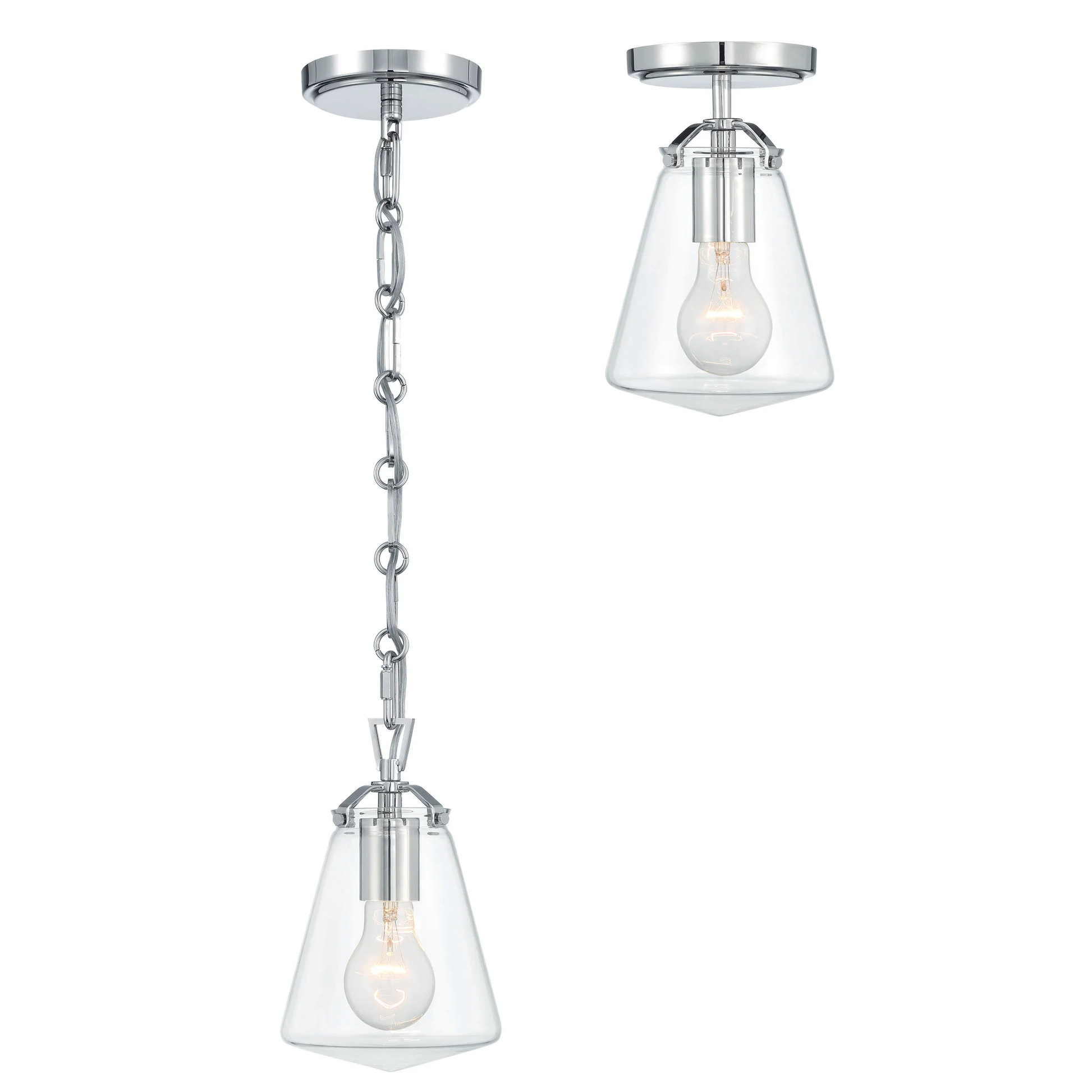 The Voss Collection is a sleek, enduring design with subtle angular details, offered in various finishes and sizes for your unique space. It’s clear glass cone-shaped pendant is closed on the bottom and fastened with metal on its open top. The patterned chain detail adds a touch of character to its streamlined design. The Voss Collection is not confined to a single style; it is a versatile design that suits a variety of spaces, from minimalist and modern to classic and eclectic.