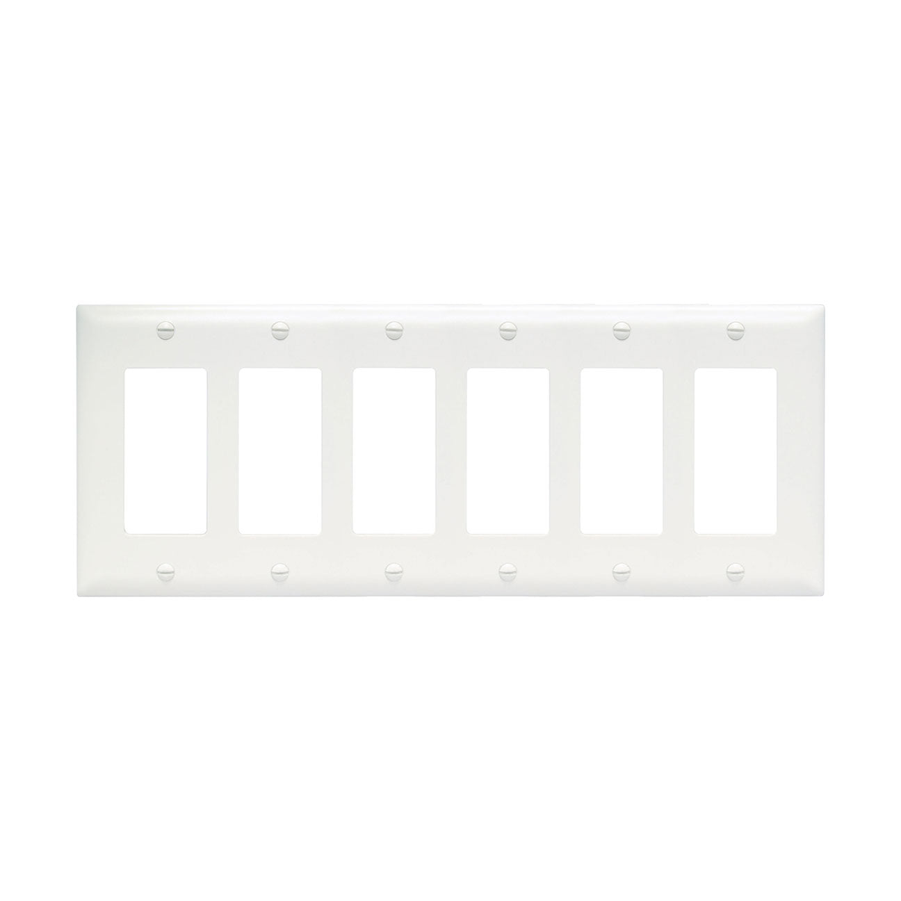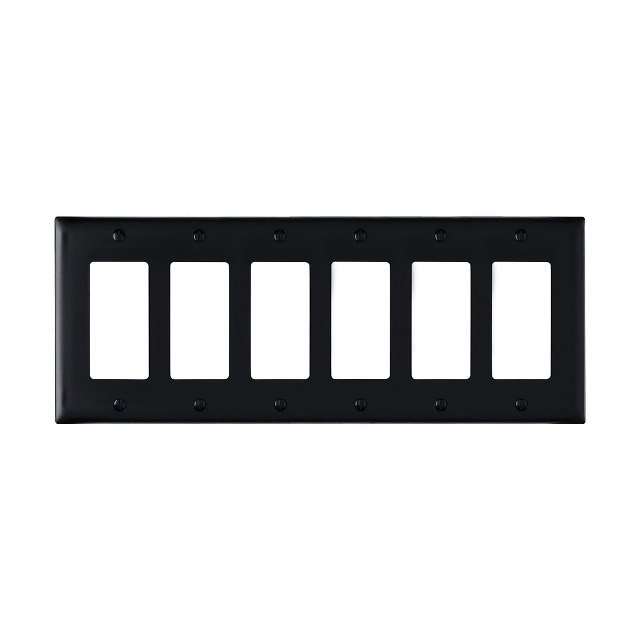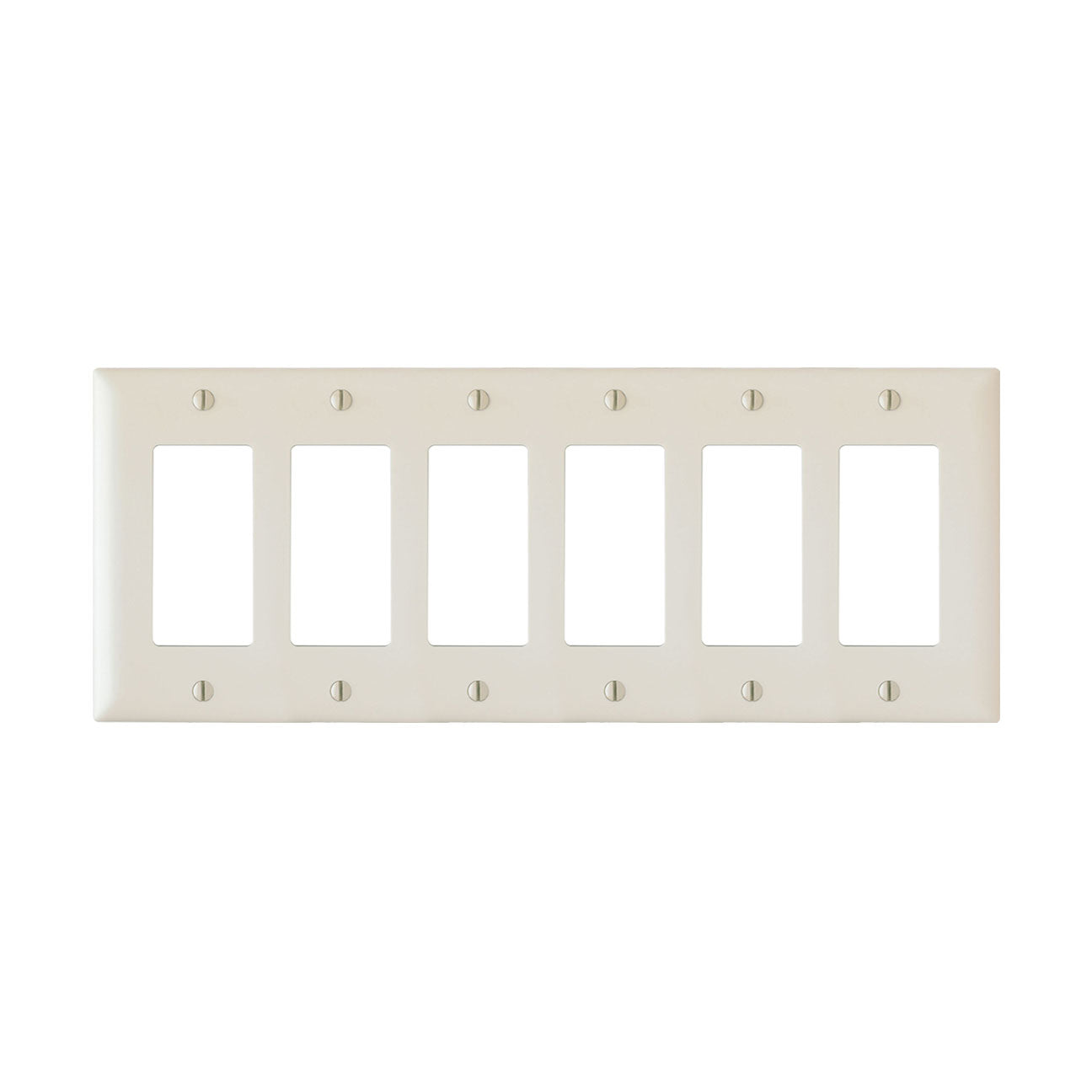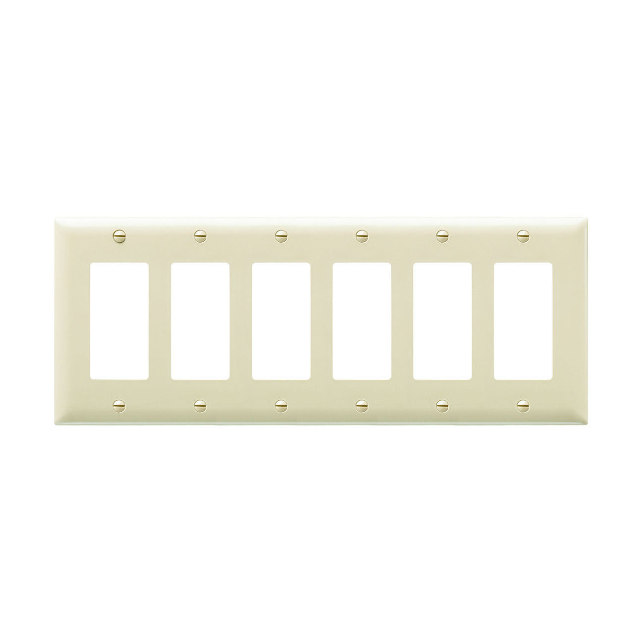6-Gang Decora wall plate provides maximum durability in plastic wall plates. Self-extinguishing nylon construction makes these wall plates virtually unbreakable. They are 3/16 of an inch higher and wider than typical plastic wall plates - not enough to be apparent to the eye, but the extra size cuts cost by reducing dry wall rework.
